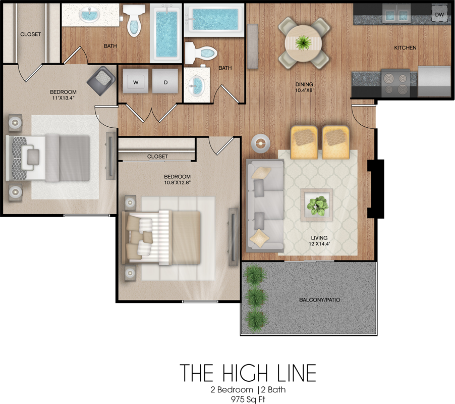 Two bedroom, two bath layout with balanced bedrooms.