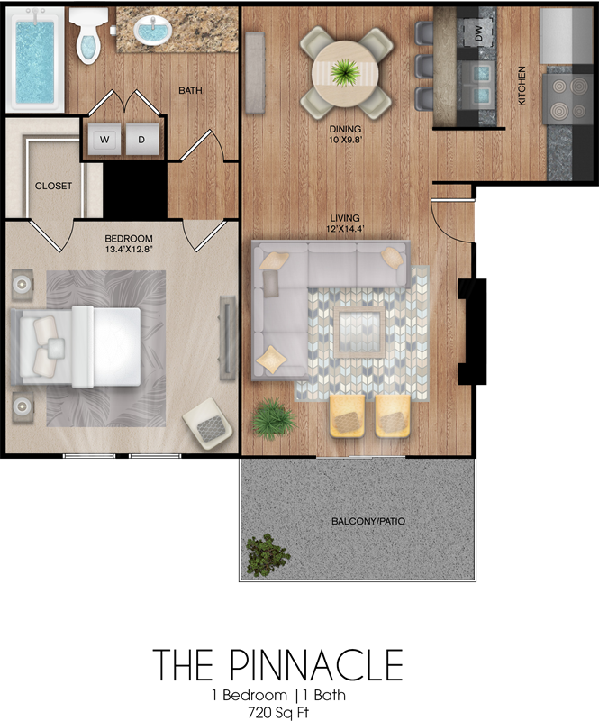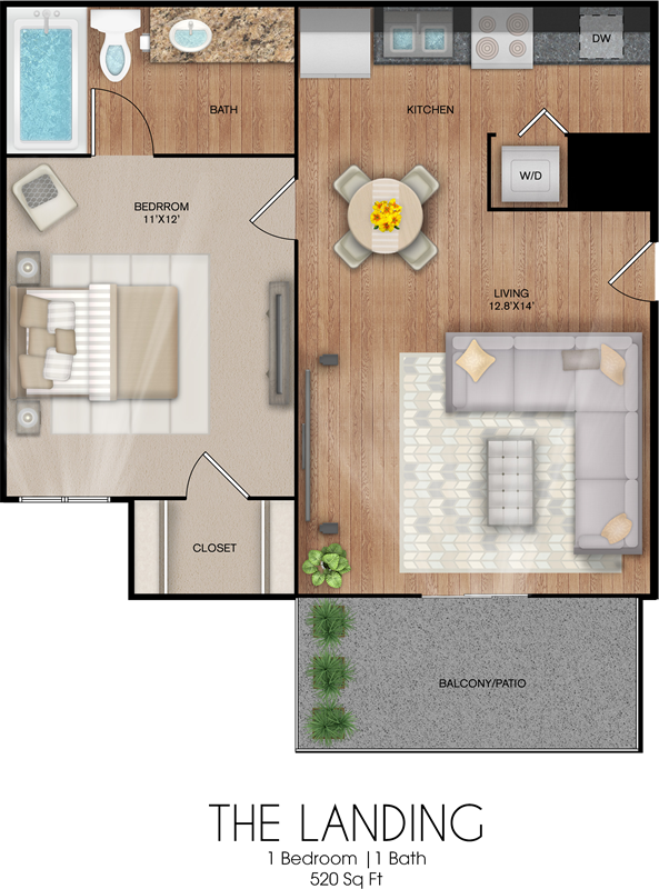 One bedroom, one bath layout with open living and dining areas.